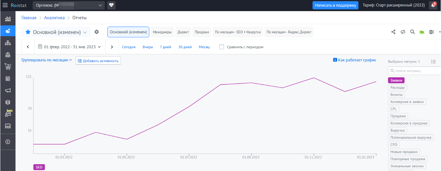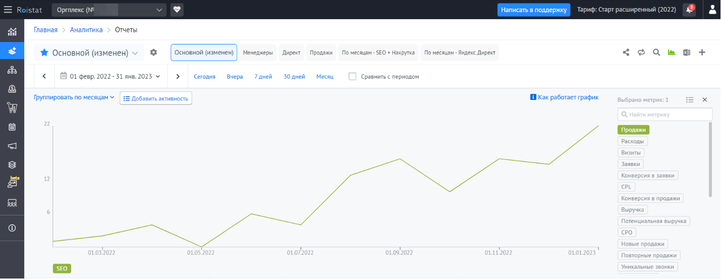 Увеличение количества продаж из поисковых систем от 2 до 22 в месяц по данным сквозной аналитики RoiStat.